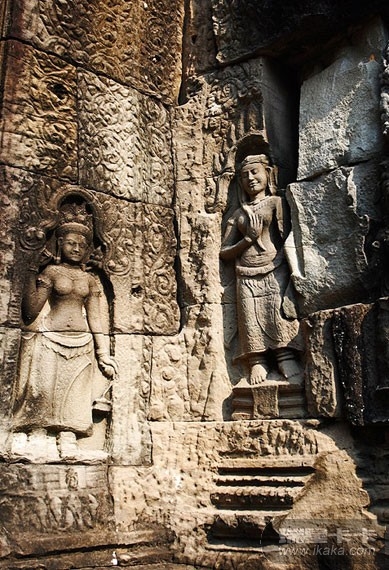 東門的石頭堆砌起來算是小規模的,到了最後看到大小吳哥內的建築,好幾層樓高,甚至是內部中空的巨大建築,外面加以精美雕刻,看到何不攏嘴。雕刻最引人注意的就是女神(Apsara),Apsara讓我想到敦煌莫高窟的飛天,下面拍的是紀錄在東門外,我首次看到的美麗女神,像這樣的高品質石雕女神在吳哥窟到處都是,緊閉雙唇、豐滿、婀娜多姿。