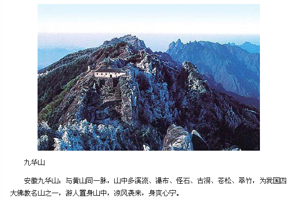 江西庐山:四大避暑胜地之一,在江西九江市,东涉鄱阳湖,北临长江,风行水上,气候宜人,7月平均气温仅22.6摄氏度,自上而下有“匡庐瀑布誉满天下”的盛名。到此消暑,环境幽静,烦热顿消