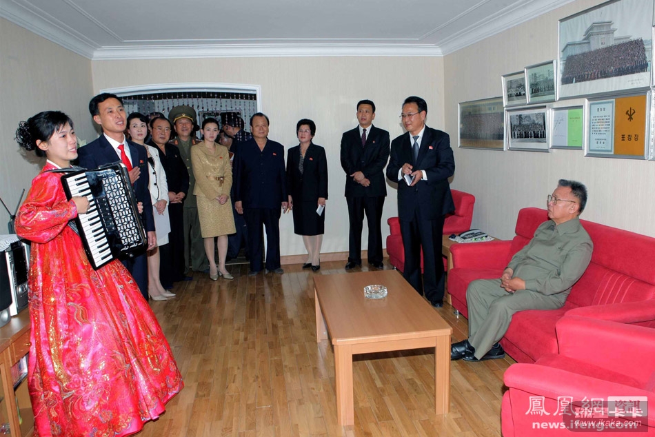 朝鲜中央社9日发布了朝鲜领导金正日对一名新近加入朝鲜国家艺术剧院的工作人员进行家访的照片。朝中社称,金正日于本周五参观了朝鲜国家艺术剧院,并参观访问了剧院演员的公寓。