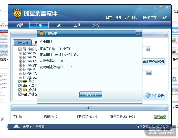 如图所示,瑞星在杀毒完成后会弹出类似的报告窗口,此时用户要想关闭这个窗口,先要点一下“确定”,然后还要点一下主窗口右上角的关闭按钮。每次查杀U盘后都要再点这两次,觉得很麻烦。在这一点上,瑞星完全可以做的更好,比如,点击“确定”后,主窗口也随之关闭。这样就充分考虑到了用户的方便。