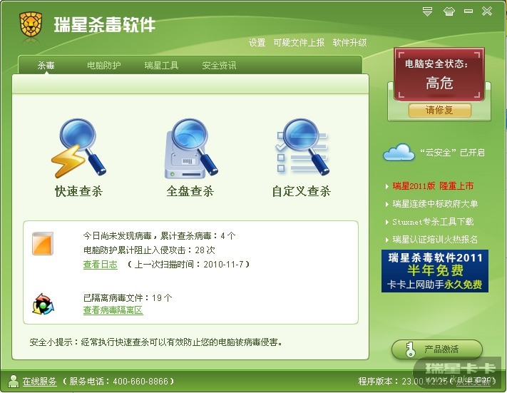 我当时以为中毒了,直接重做系统后在瑞星网站下载2011升级版,安装后产品激活输入序列号激活就好了。