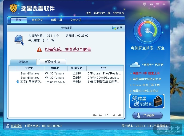 正版瑞星刚从瑞星2010自动升级到瑞星2011 结果一扫描 扫描出来3个文件 我觉得是误报,我想问下技术人员 这些确实病毒 还是确信是误报。。。上图。