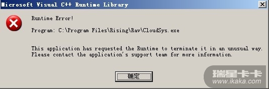升级要求重启两次,重启后,无法进入瑞星杀毒主界面,提示:“来自网页的消息说:[出现未知错误]。