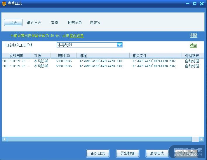 请楼主右击托盘处的瑞星监控/查看日志/备份日志,将日志导出后上传,同时请提供瑞星版本号及KMPlayer版本号。