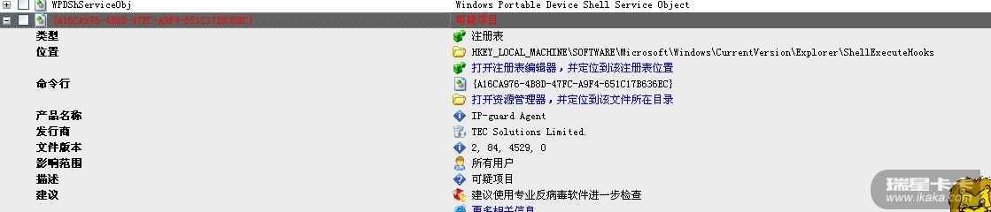 {A16CA976-4B8D-47FC-A9F4-651C17B636EC} 优化大师显示为可疑文件,我是付费瑞星最新版本,杀不出该病毒,请问大虾门有没有改病毒的专杀工具提供给小弟???