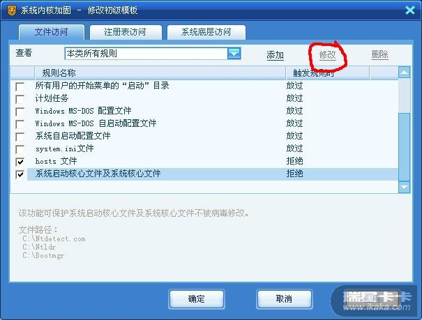 系统内核加固无法修改触发规则时的动作,修改项是灰的,鼠标右击无反映.这个难道只有瑞星全功能可以改,杀毒版的不可以改:kaka6: