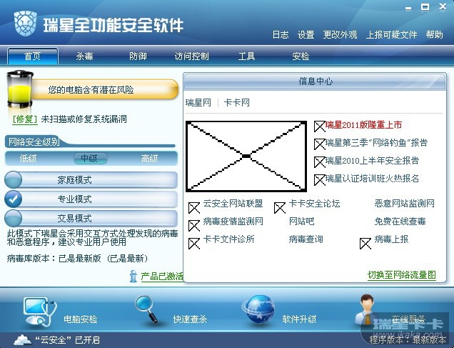 我从家里有电脑后一直是用瑞星的。但我对现在买的2010很不满意,当然,凭良心讲,对这里版主的回复速度还是满满意的,再次谢过。首先是我买的软件序列号无故被别人的通行证注册了(已说过,在此不提)。现在的问题是我的瑞星2010版安装了已经有1个多星期了,但仍然没有进行过一次成功的升级,始终显示“已是最新版”,个人认为很不正常。望万能的版主帮忙解决!!