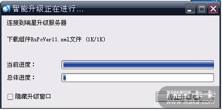 3.点击[软件升级]进到两个对话框,好像叫做什么来着的.xml文件时停顿一下,连接到瑞星升级服务器时对话框几关闭了,无法升级。