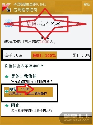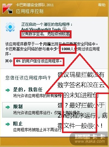 如上图 卡巴提示 :“有多少用户使用xuetr ,其中都选择了 阻止”,有这样的提示 ,用户就知道如何操作了!!!
