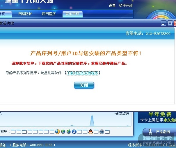 昨天防火墙自动更新,重启安装的时候快完了就不动了,等了很久.没办法只有取消,居然把我以前的版本也删了,只有去官网下一个,安装完了打开软件激活,输入了序列号就出现附件上说的:产品序列号/用户ID与您安装的产品类型不符.然后我只有卸了从新去官网下,这次点的是升级,输了序列号之后只有附件2的这两个,以前都有防火墙的,为什么现在没有了啊,前段时间提示过期了,以续费.为什么不能激活啊....:kaka4: :kaka4: :kaka4: