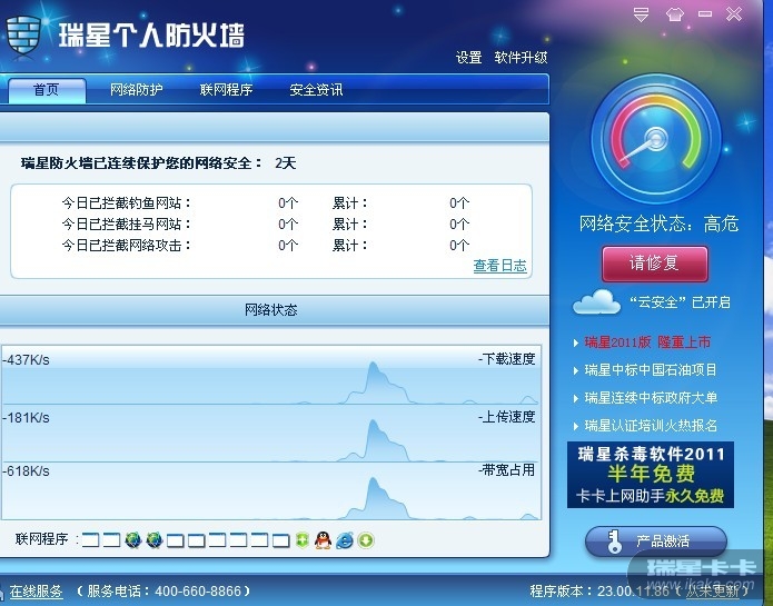 2011版RX墙,软件右角版本提示从未更新,网络安全状况:高危