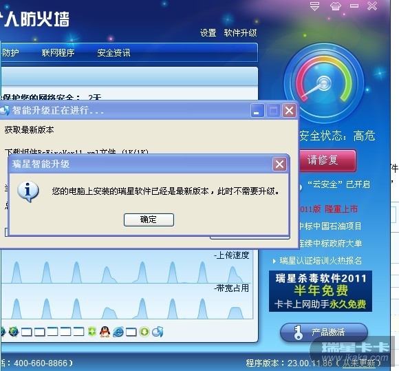 如果是10升级版11版的话,这个版本号已经是最新版本了,等待下次瑞星防火墙升级后就会提示正常。或者可以卸载了目前的防火墙,在官网下载2011版本进行安装升级。