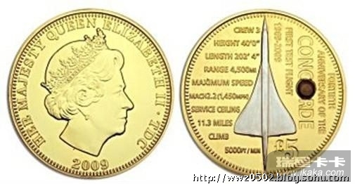 2.特里斯坦-达库尼亚群岛带有小块协和飞机钛合金的硬币这枚硬币是为了纪念协和式飞机首航40周年,在2009年铸造的。硬币表层镀金,每面都含有一小块从协和飞机上取下的钛合金,将所有硬币收集起来,你就可以建造一架迷你型和协式飞机了。