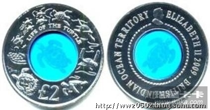 6.英属印度洋领地蓝色水晶与银龟此硬币面值为2镑,由英属印度洋领地制造,特征是在固体银环中的蓝色水晶中,嵌入了一只乌龟。有人说那只安静的蓝色乌龟,实际上是只活龟。