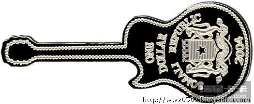 16.重金属吉他, 索马里索马里人民很会铸造独特的硬币,就像这把 Gibson Les Paul 吉他形状的硬币.精良的制作工艺,使得这枚硬币显得格外漂亮与精细.