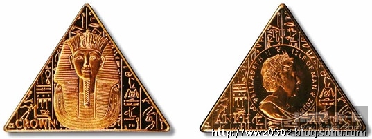 18.埃及金字塔, 马恩岛世界上首枚金字塔形状的硬币,是由马恩岛的居民铸造的。(译者注:马恩岛是英格兰与爱尔兰间的海上岛屿,是英国的皇家属地。)硬币表面镀铜,代表了图坦卡蒙的死亡面具,以及一系列复杂的象形文字。与穿着华丽的法老比较起来,莉兹皇后穿得异常单薄。