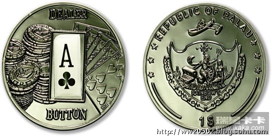 20.拉斯维加斯的幸运, 帕劳共和国帕劳共和国的这枚硬币,是百分百的法定流通硬币,甚至可以在拉斯维加斯的赌场中花费。硬币镶刻了在日落大道扑克锦标赛中使用过的扑克一角。记住赌  博是不会赢钱的.好好想想吧!