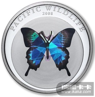 23.棱体蝴蝶, 帕劳共和国这只漂亮的蓝色山蝴蝶,是用细小的棱体制作而成的,薄薄的棱镜能随着光线的变化而闪烁并改变颜色。固体的纯银底座,使得这枚硬币显得格外洁净,并极具艺术抽象感,更能衬托出棱体蝴蝶的美。