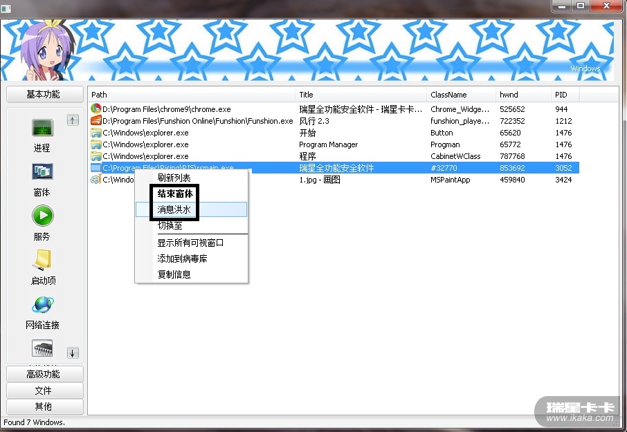 对瑞星的主程序 进行洪水攻击 ,也能结束瑞星的进程