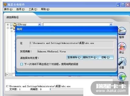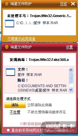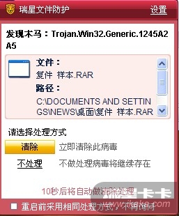 在压缩打包病毒的时候,瑞星监控发现存在病毒。我选择了清除。
