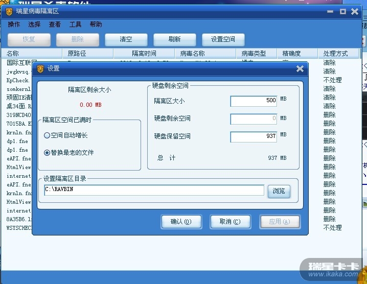测试了一下,发现隔离区默认的是至少需要保留1G的空间,否则,杀毒软件将无法工作或者是无法正常工作(因为杀毒软件不会处理任何病毒,是否病毒在运行状态瑞星是否会结束进程,这个还没有经过测试)