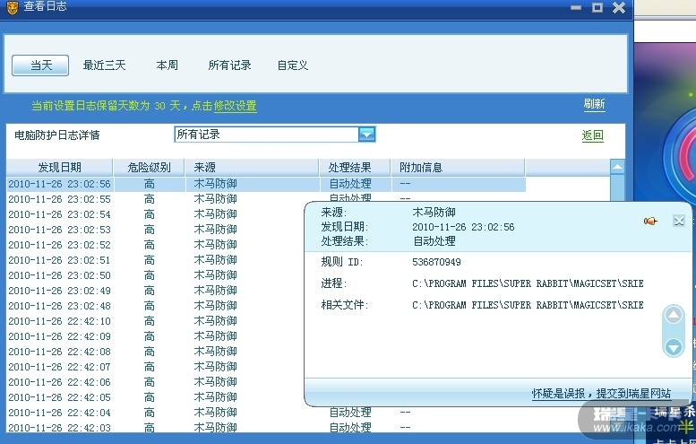 如果确认该软件是因为瑞星拦截的缘故无法使用,还请在这里提供瑞星日志和超级兔子以及瑞星的版本,我可以帮你测一下。