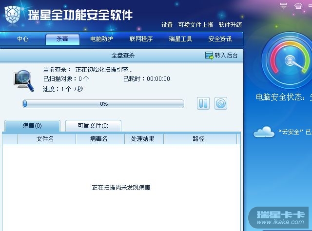 我用瑞星全功能安全软件2011版本在安全模式下进行病毒扫描,可是打开瑞星杀毒软件扫描时,一直出现正在初始化扫描引擎,一直就卡着不动。多次尝试也是不行,把瑞星杀毒软件进行修复后,在安全模式无法进行病毒扫描。在正常模式下可以进行病毒扫描。 版本号是:瑞星全功能安全软件23.00.15.56 操作系统:windows xp sp3