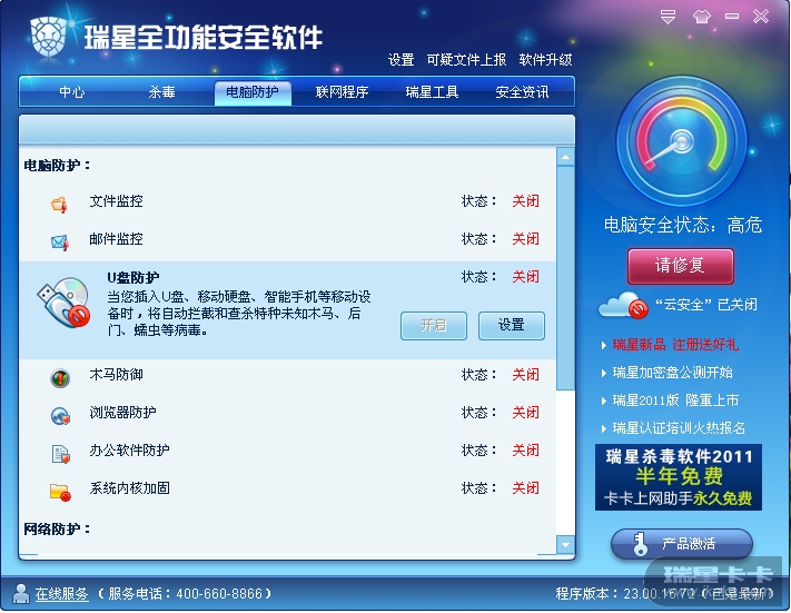 正版瑞星全功能安全软件,11月28日升级完成之后,只要开启所有电脑防护之后就不能上网,QQ、MSN等都登陆不上,把电脑防护关上之后就一切正常了;并且也无法单独设置某个防护的“开启”与“关闭”,只能在任务栏里用鼠标右键单击小伞形图标选择“开启所有电脑防护”或“禁用所有电脑防护”。如图