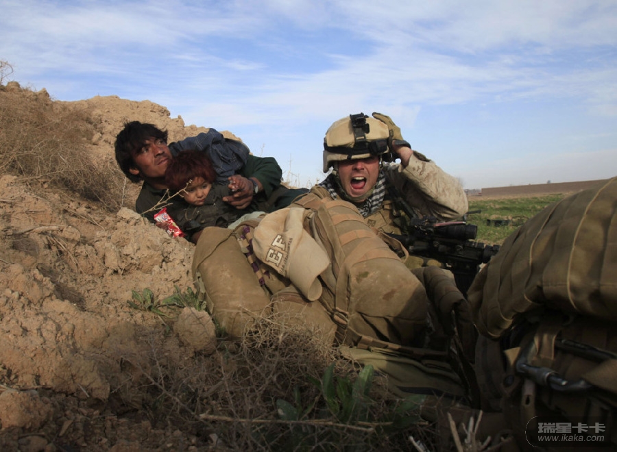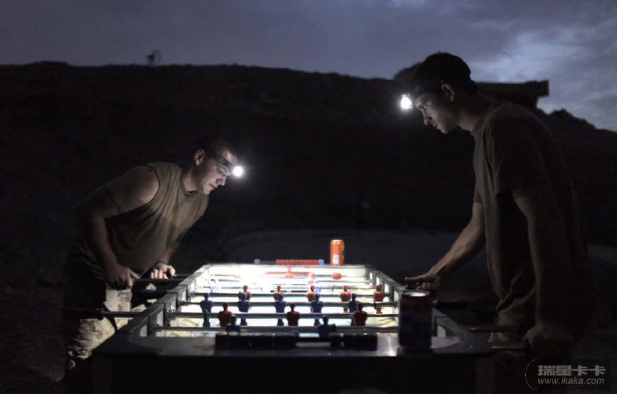 8月8日,阿富汗坎大哈省的加拿大陆军基地。图为:两名士兵戴着头灯,正在玩桌上足球。