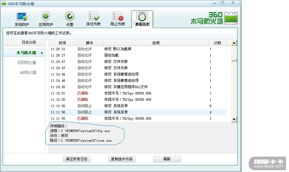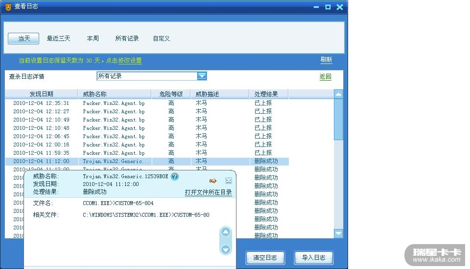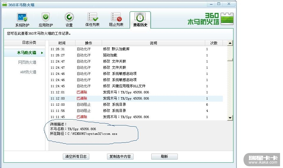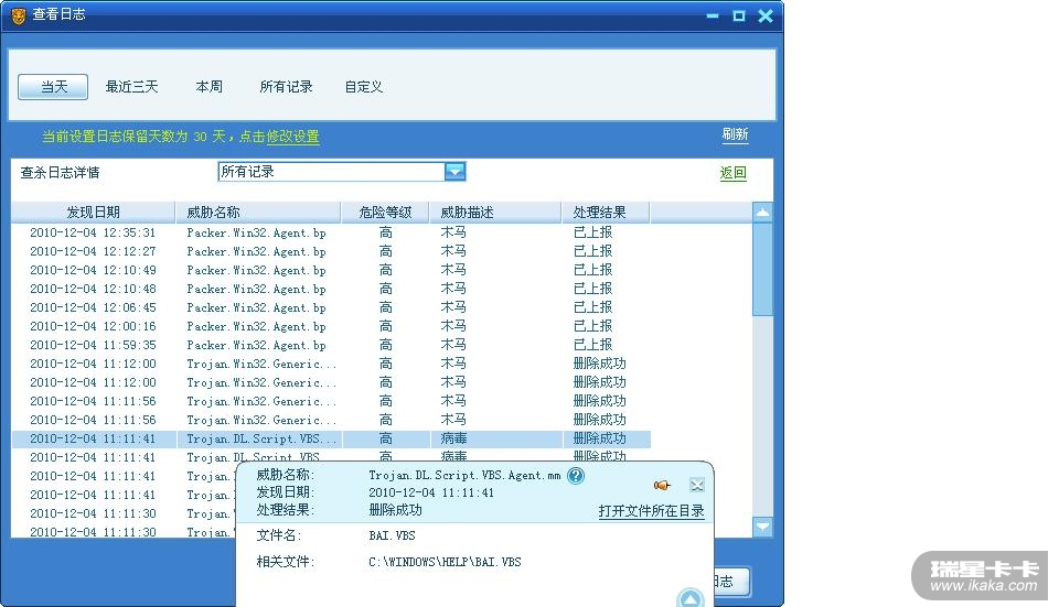 瑞星升到最新版,在安全模式下什么也没杀出来,用360全盘查杀也什么也没有,可一上网就会自动发现病毒,今天就是这样,瑞星和360同时发现,删除成功,可不一会就出现了,光今天瑞星就发现了50多个.