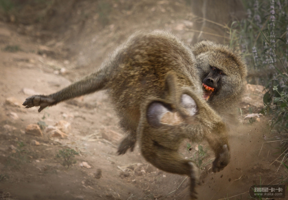 14 照片中靠前的那只狒狒正在骚扰一只小狒狒,正对着镜头的雄狒狒又对骚扰者发起了攻击。尽管整个战斗只持续了几秒钟,但却惊天动地,凶狠无比。群落中的其他成员四处逃散给它们让路。毫无疑问,狒狒群落中始终在上演一幕幕大戏。