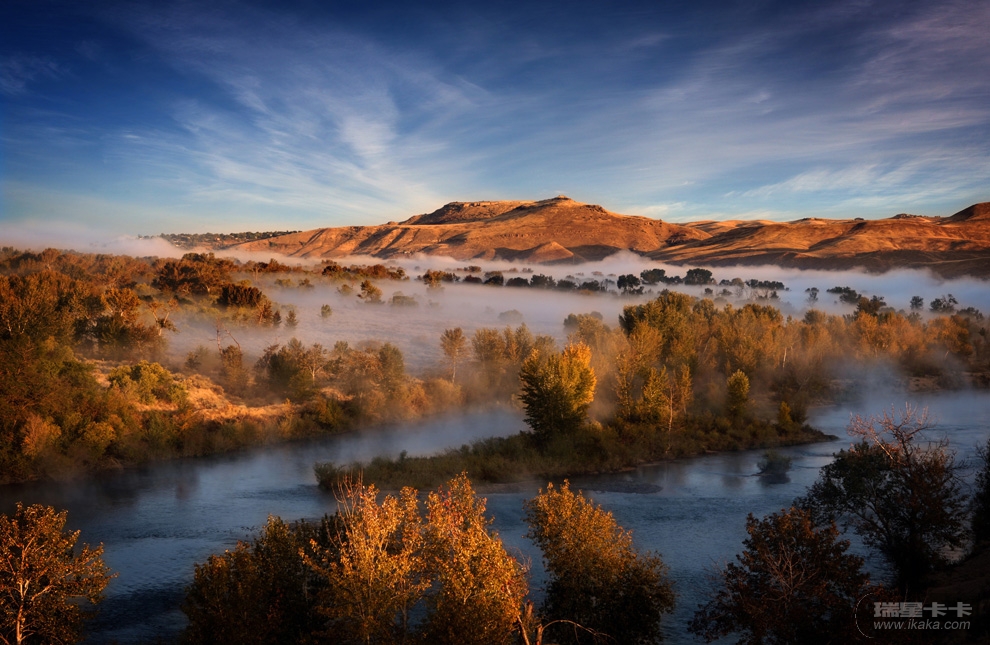 17 博伊斯的日出。薄雾笼罩,晨光熹微,这是我一心向往的地方。如果你仔细观察,会发现照片中央偏左的空地上有一头鹿。一个小小的圆点,脑袋探在灌木外边。