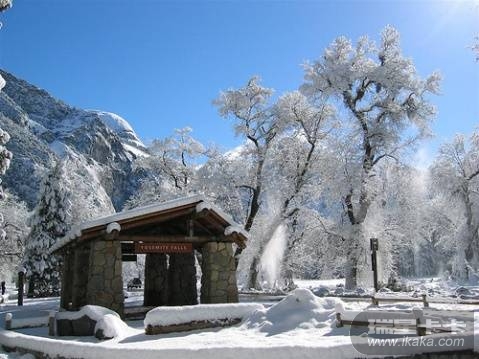 约塞米蒂瀑布公交车站,位于美国加州,简单的条石和横木结构,架起了都市人躲避喧嚣的世外桃源。