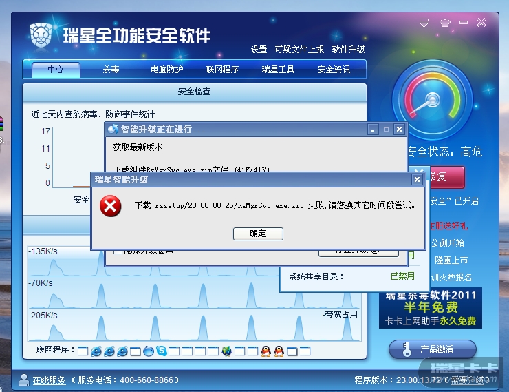我的杀素软件不能升级,开始升级一小会后就提示错误,说要过一个时间段再试,要怎么办?谢谢。