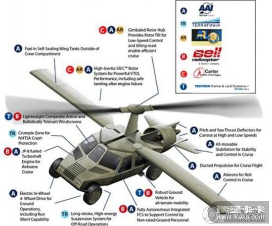 在之前一个名为Terrafugia的公司发布的会飞的汽车引起了广泛的关注,而这款飞车甚至是已经公布了北美地区的售价,随着该产品的问世,近期美军正在研制一种“变形金刚”装甲飞车,它是在路面行驶的悍马和在空中飞行的直升机的结合体。这种詹姆士·邦德座驾风格飞车将成为战胜塔利班的最新武器。