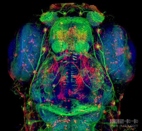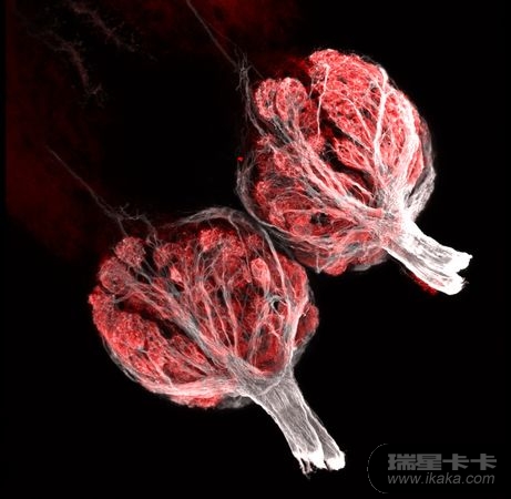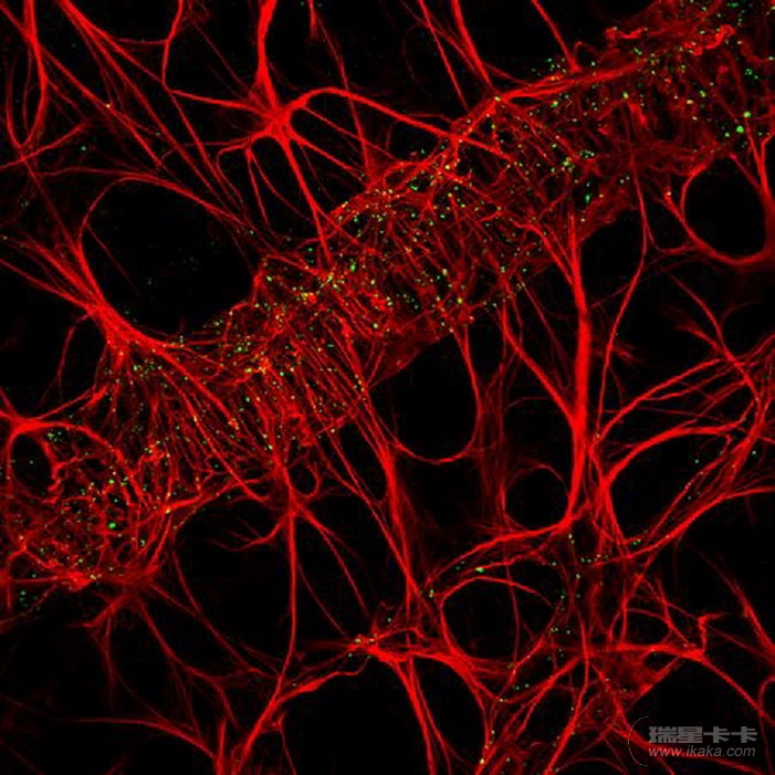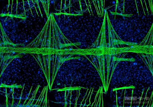 由于有绿色荧光蛋白的基因植入,癌细胞发出绿色的荧光。苏格兰邓迪大学的保罗•安德鲁斯(Paul D. Andrews)使用荧光灯拍摄了这张照片。