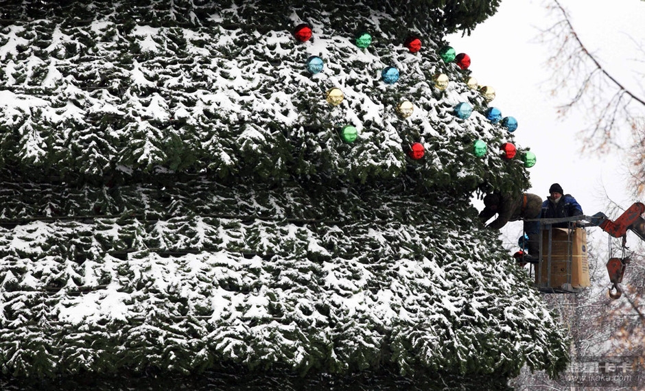俄罗斯西伯利亚城市克拉斯诺雅茨克,工人正在装饰一颗151英尺高的圣诞树。据当地媒体称,这是俄罗斯今年圣诞树中最高的一颗。