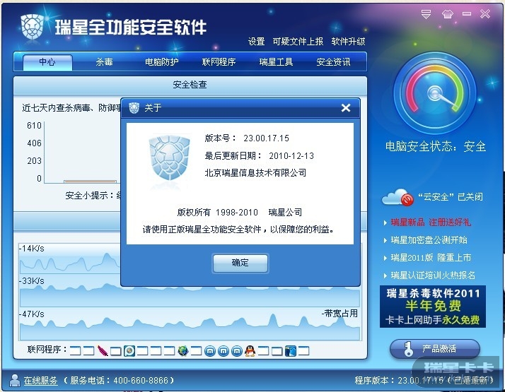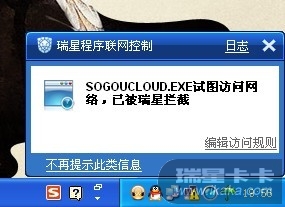 在使用瑞星杀毒软件的时候,我的瑞星一直提示这个这个东西。后来查了相关的设置以后,没有拦截。为什么一直提示拦截的信息。分析了一会儿。还是不行。毕竟不是专业人员。于是发帖恳请贵公司的相关工作人员以及各位星迷朋友们帮帮忙!看看到底是什么原因出的问题。如图
