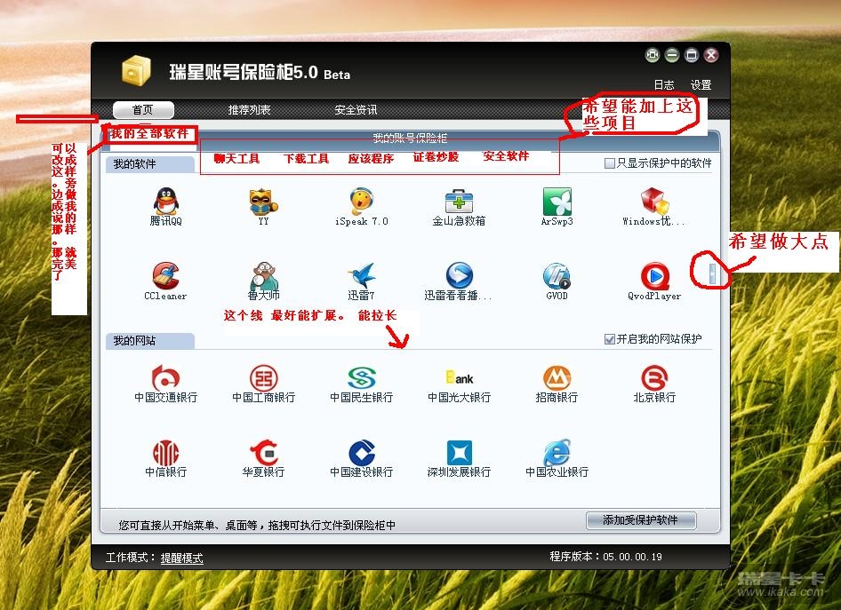 我希望能像360那样 在首页 我的软件旁能多加个几个存放口。 比如 我的聊天工具 下载工具 应用软件 证卷等等等选项。