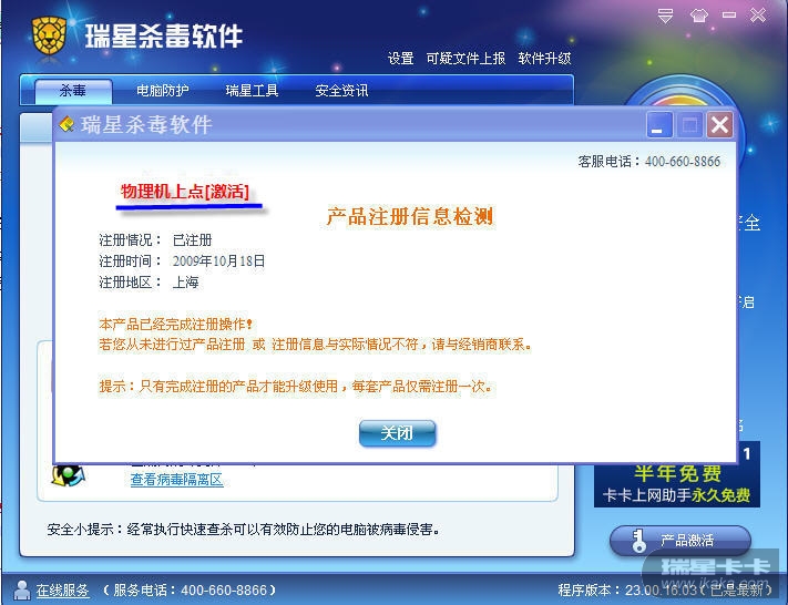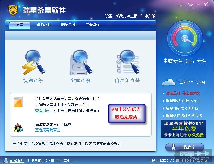 2.用本机杀软今日23.00.16.03版制作的安装包再次安装到虚拟机。还是不能激活。用[修复]来修复后,还是不能激活。其实这个修复以前都已试过了,只是在贴子里没提起而已。