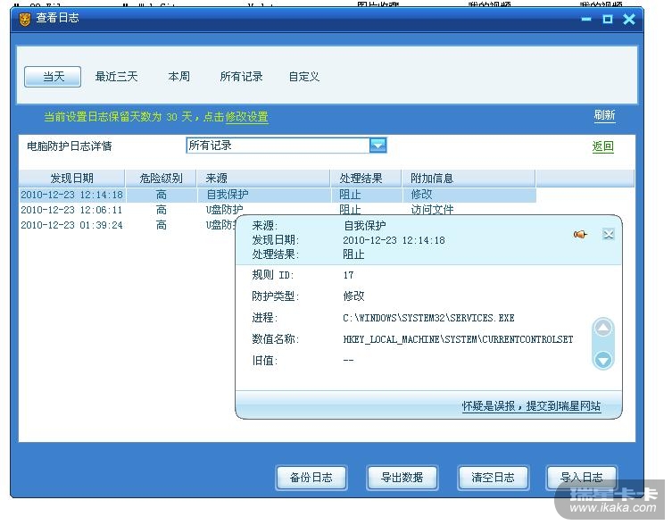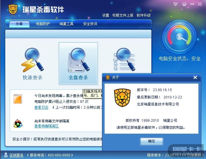 未装其它安全软件,只装了瑞星杀软,防火墙,卡卡。