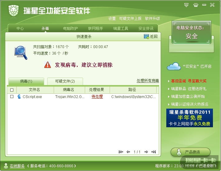 瑞星升级至23.00.18.89后快速扫描误报cscript.exe ——DOS环境下的脚本宿主引擎。