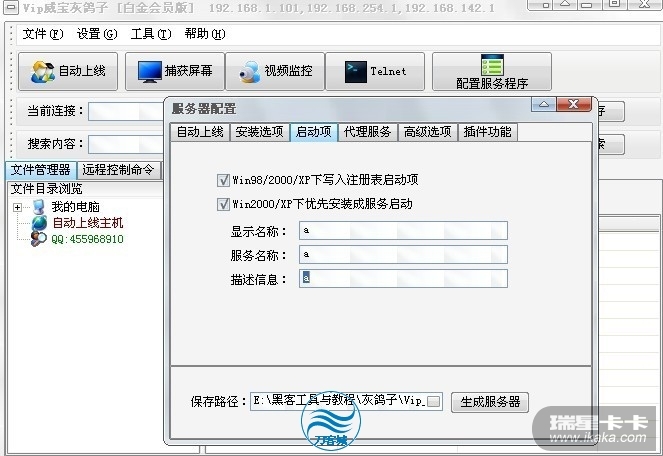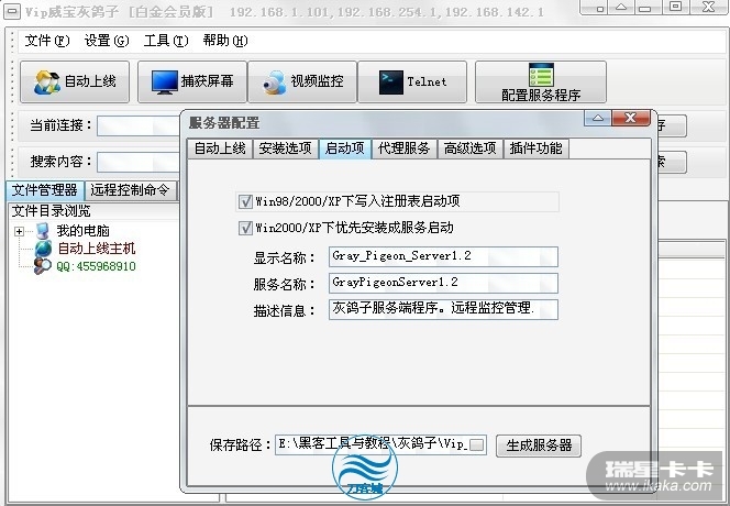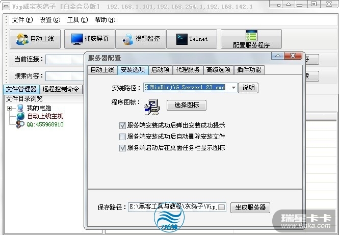 首先让我们来分析下瑞星的查杀方式。我用的远控是灰鸽子。测试了下。在过瑞星云查杀的条件下。将所有的勾,就是不自删除,不添加服务启动和注册表启动,不插入IE等。就可以过瑞星主动防御。可是问题就来了。假如不添加服务启动和注册表启动,那么重起如何上线?本想去百度一下到底瑞星的查杀,到底查杀的是什么,可是因为是刚出,还没人突破。各大黑客论坛都讨论的热火朝天呢。哎。自己研究吧。找到了一个教程。他是这么说的,只需将uninstal.bat的bat进行填充。见图1: