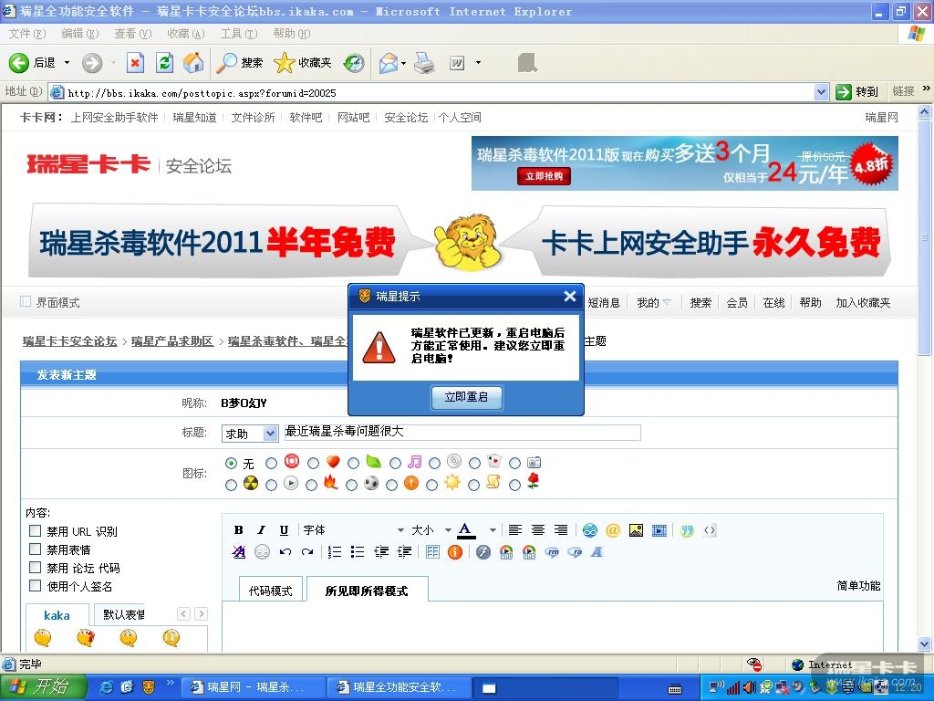 进过一番检查,瑞星存在,单击伞无反应,单击狮子,跳出如下图的提示,点重启还是老样子,没雨伞。重新点狮子还是这样。之后卸载瑞星,安装老版本,雨伞出现,狮子正常,以为升级好万事大吉,结果一到最新版本,还是老样子。