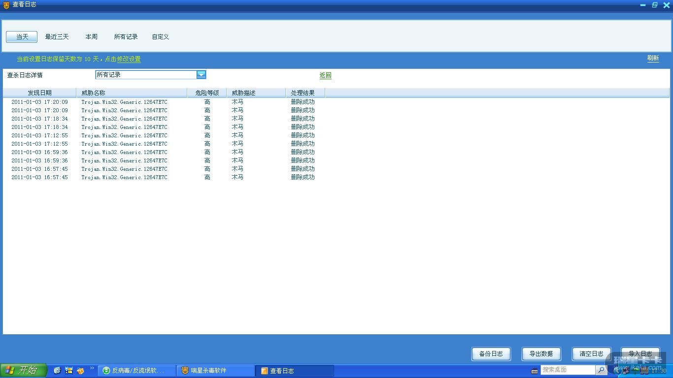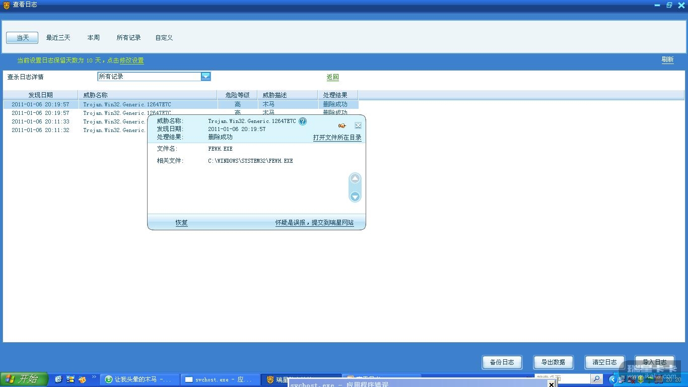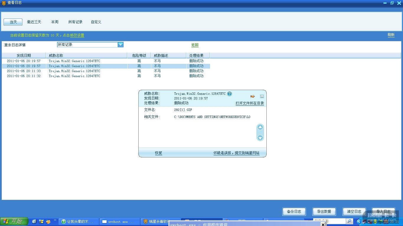 我的笔记本是拨号上网模式,最近中了Trojan.win32.Generic.12647E7C的木马,怎么也杀不掉啊!用瑞星的全盘查杀也查不出来,只要上网了,一会就提示发现这个木马!我该怎么处理啊?高手们快给我想个办法,我把瑞星的截图上传。