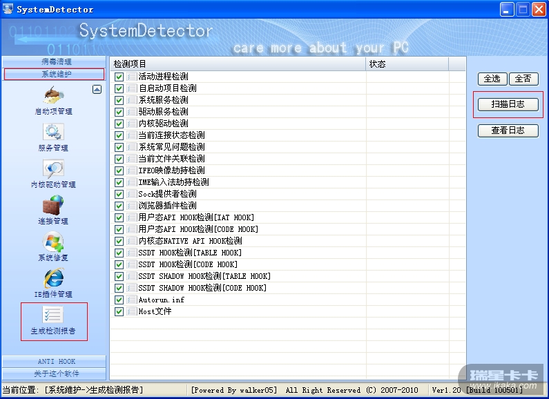 不好意思 我没找到日志扫描 只有系统维护 病毒清理啊
