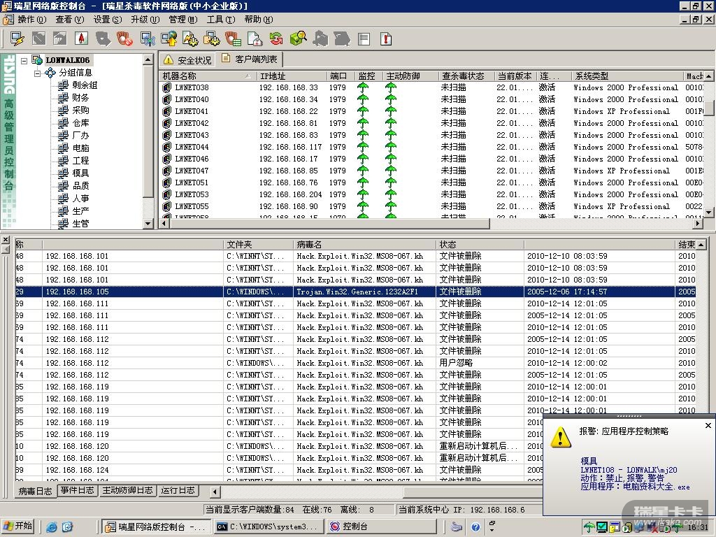 另外,查看染毒计算机windows\system32目录下是否存在netapi32.dll文件。 windows2000 sp4系统下,此文件版本为:5.0.2195.7203 windows xp sp2/sp3系统下,此文件版本为:5.1.2600.3462/5694 windows 2003 SP1/SP2系统下,此文件版本为:5.2.3790.3229/4392 windows 2008 vista系统下,此文件版本为:6.0.6000.16764;6.0.6000.20937;6.0.6001.18157;6.0.6001.22288 如果版本正确,说明系统已经成功修补了MS08-067漏洞,升级瑞星至最新版本,可以彻底根除。 若没有此文件或者版本不符,说明此补丁没有打上或者没有打全,建议在控制面板-添加删除程序中将其卸载,重新修补漏洞。