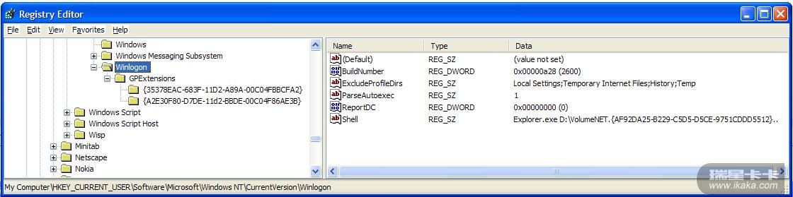 看一下这个注册表项内容是什么:[键]HKEY_CURRENT_USER\SOFTWARE\MICROSOFT\WINDOWS NT\CURRENTVERSION\WINLOGON