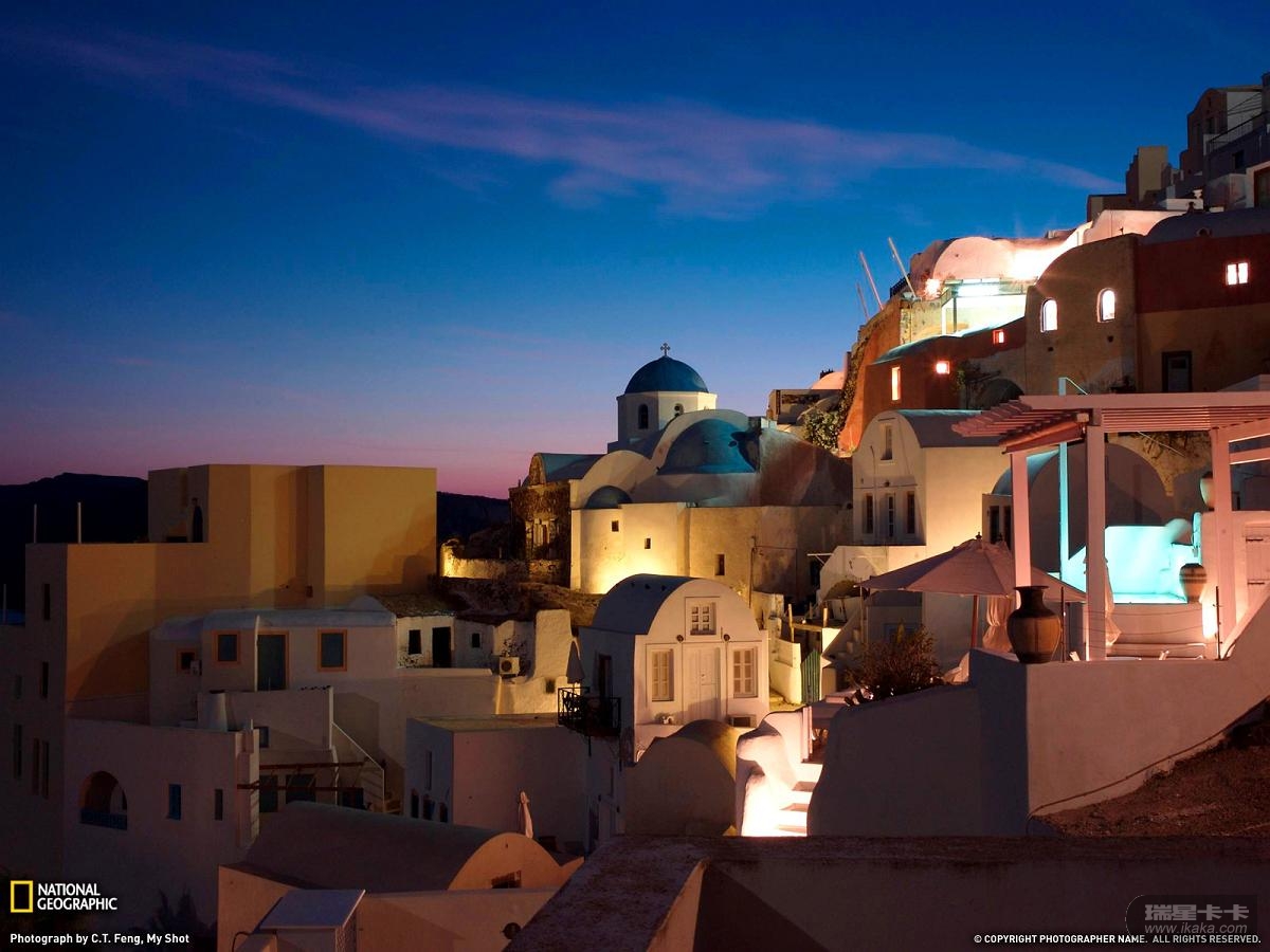 拍摄者C.T.芬说:“去年,临近秋末,我来到希腊的圣托里尼岛,当时岛上大部分店铺因冬天开始歇业。我希望捕捉到一张奥伊亚小镇在黄昏时分的清晰照片,奥伊亚镇经常被摄影师当作拍摄的主题。我用照相机上的仪表来曝光,但效果始终比我所期望的要暗。于是,我抱着闹着玩的想法,令它的曝光时间尽可能地长,至于色彩,则顺其自然。结果,照片中的小镇成了一个美丽的玩具模型。”写于2007年10月。