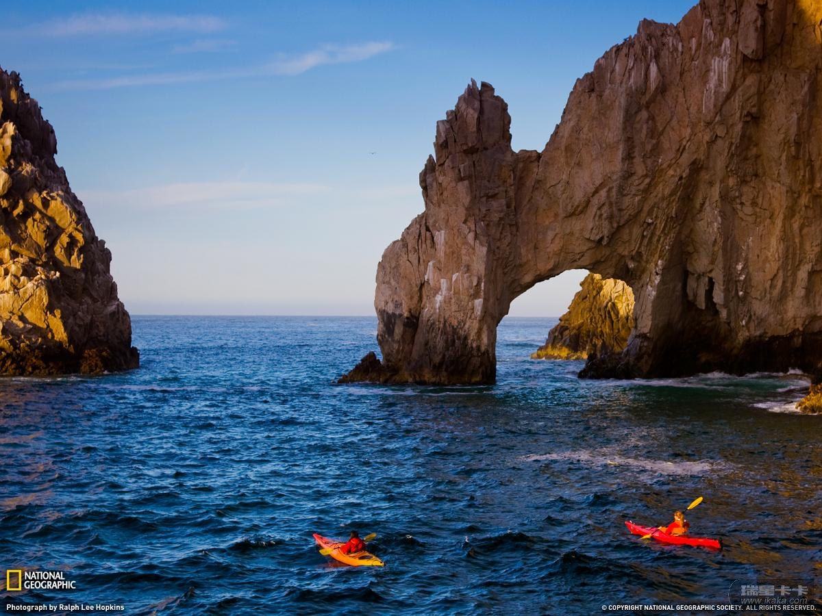 单人皮艇驶过“陆地尽头”。“陆地尽头”位于墨西哥境内的加利福尼亚半岛南端的卡波·桑·卢卡斯,是一个很受欢迎的旅游景点。对这片风景独特的海岸的持续开发,已经引起人们质疑,这样的开发可能危及环境。